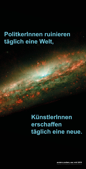 Aktuelle Ausstellung:* sofa68 Winterschlaf/Hibernation Phase: *vom 17. Dezember bis 17. Jänner, sofa68 wird umgebaut und ist von aussen zu sehen *Finissage/1968 auf dem Sofa – Performance der Umherschweifenden Produzenten: *Di, 17.01.2019, 19.00 – 20.00 Uhr *Art’s Birthday:* Di, 17.01.2019, 18.00 – 22.00 Uhr mit Liveübertragung von 20.00 – 22.00 Uhr auf Radio Helsinki 92.6 FM und https://helsinki.at https://helsinki.at/; Ö1 Kunstradio __ Sujet: NASA Space Telescope Science Institute