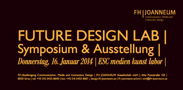 *Future Design Lab - Donnerstag, 16. Jänner 2014 * Future Design Lab | Symposium Designer, Künstler, Schriftsteller, Theoretiker und Journalisten denken grundlegend über das Thema Design nach. Dabei werden historische, philosophische aber auch praktische Aspekte behandelt.